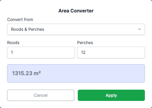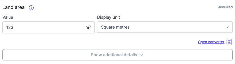 The area converter allows you to input area measurements in various units and convert them to your desired display unit. The area converter is available for area fields during document review: land area, unit area, car space, storage space, and other space.