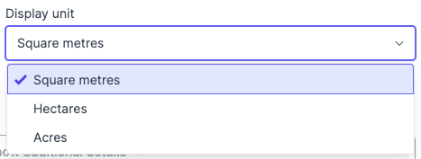 You can display area values in square metres (m²), hectares (ha), or acres. The selected display unit appears in your reports.