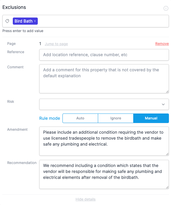 Click "Show additional details" on the Field, then use the Rule mode toggle to select "Ignore". The recommendation will be struck through and excluded from the Report. Alternatively, switch to "Manual" mode to edit or clear the recommendation text.