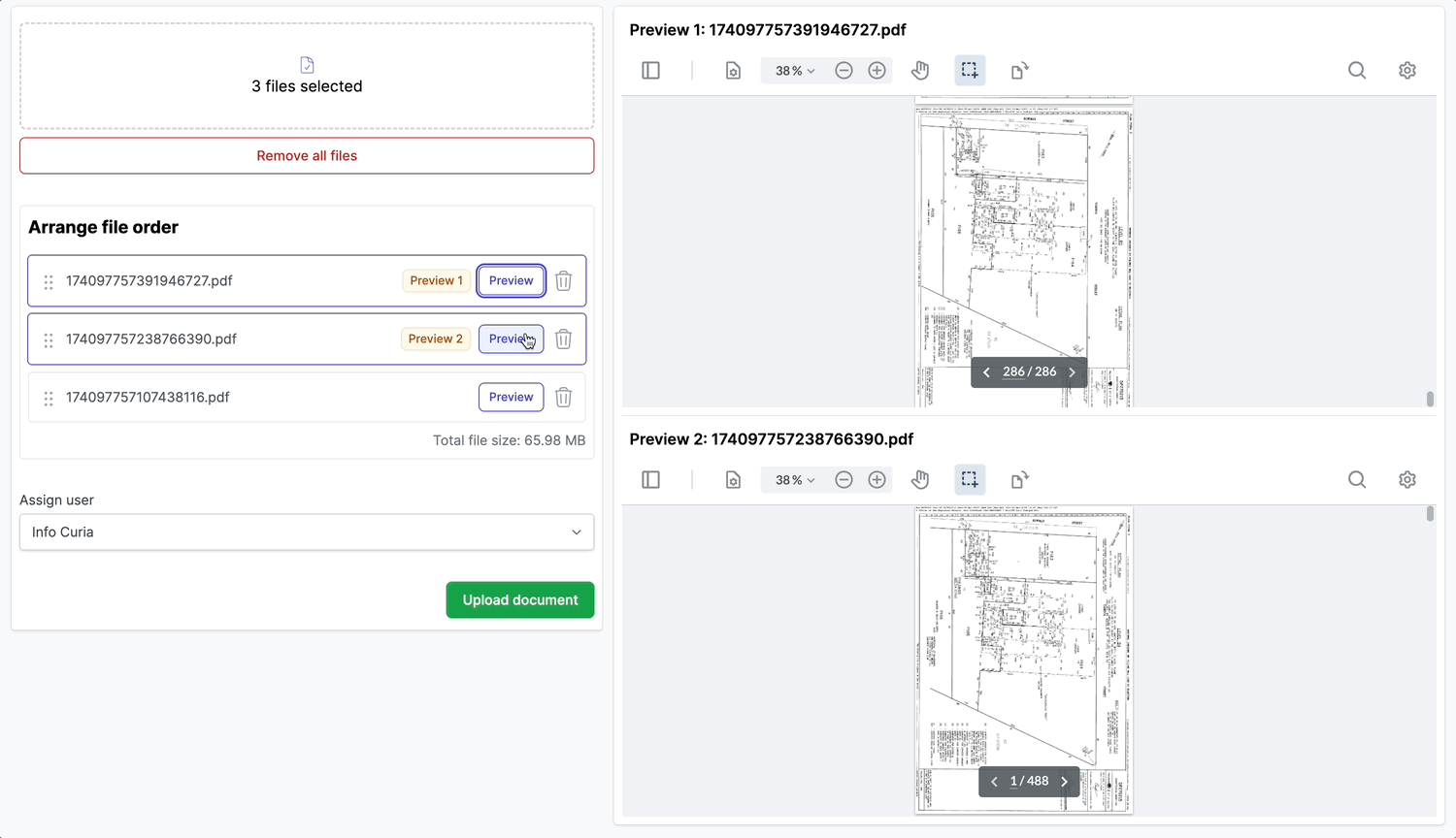- When two or more files are selected, Curia shows a dual preview with "Preview 1" and "Preview 2" viewers.