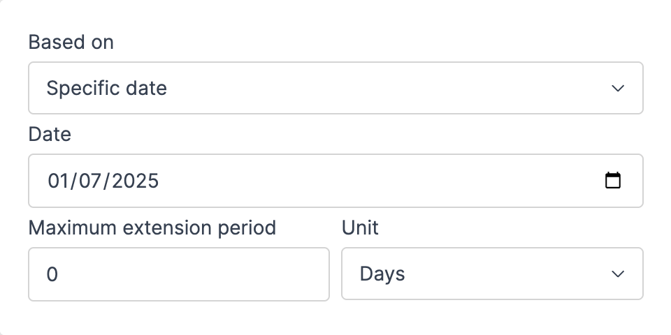 - Enter the extension period value and select the unit (Days, Weeks, or Months).