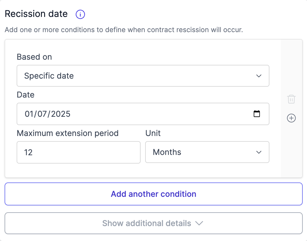 - When configuring any rescission condition, click "Show additional details" to reveal extension options.