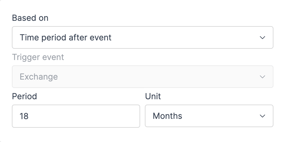 - Add second condition: Select "Time period after event", enter "18" months after exchange.