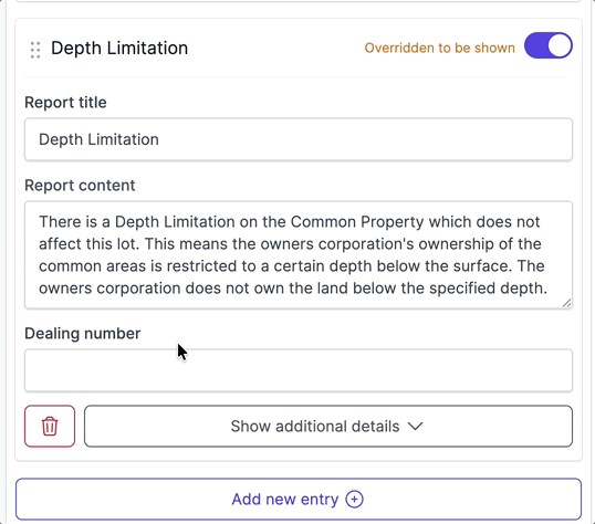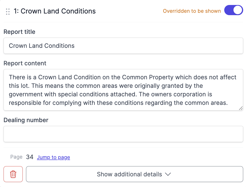 Custom Dealings allow you to manually add dealings that aren't automatically detected or categorised by the system. These are particularly useful for unique or uncommon property interests specific to your region or transaction type.