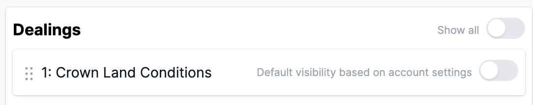 Each title search section includes a master toggle to show or hide all Dealings for that specific title search at once. When some Dealings are visible and others hidden, clicking "Show all" makes all Dealings visible for that title search.