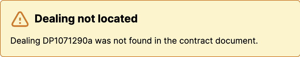- They do not generate warnings if missing from contracts - Since custom dealings are manually added rather than detected, the system assumes you're adding them for a specific purpose and won't warn if the dealing document isn't found in the contract.
