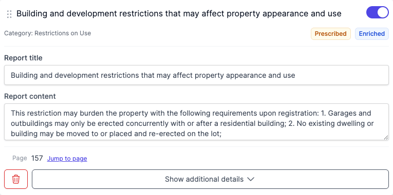 - Enriches important Dealing types with specific details from the Dealing documents (enrichment means the system automatically extracts specific information like exact easement locations or covenant obligations from the actual dealing documents, rather than using generic descriptions).