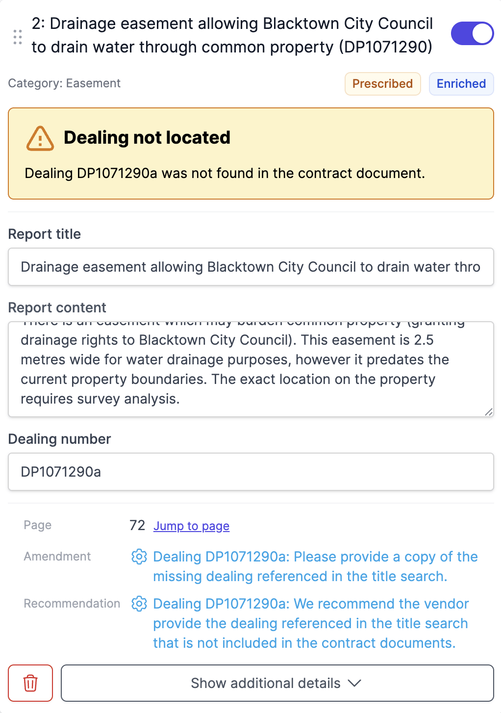 The system alerts you when Dealings mentioned in title searches cannot be found in the contract documents. This is particularly important for prescribed documents that must be legally disclosed.